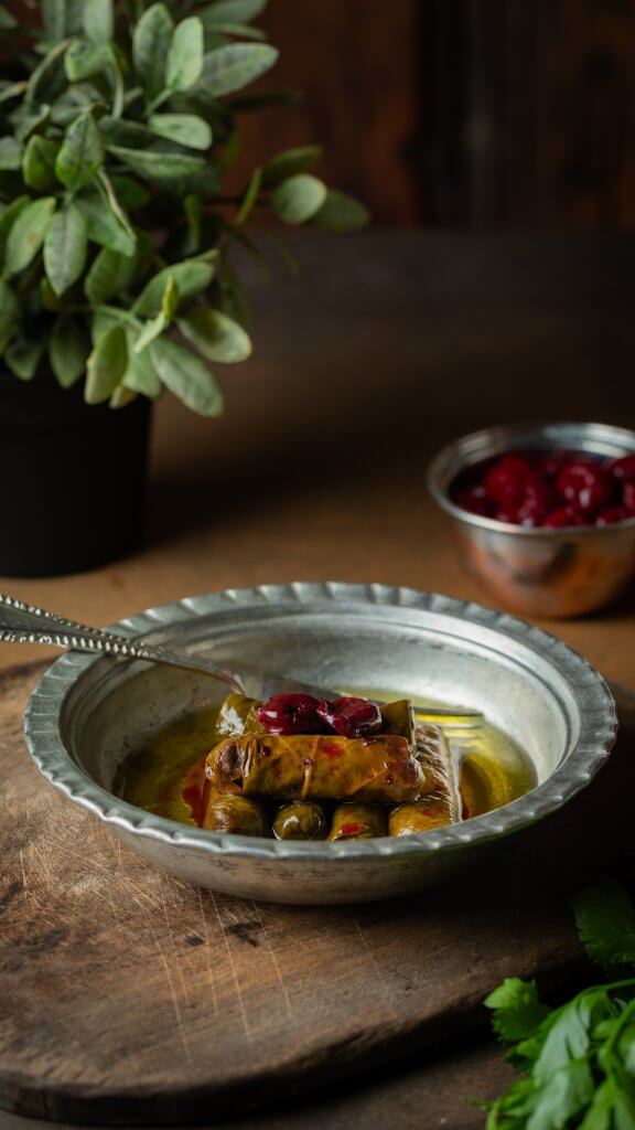 To make Stuffed Vine-Leaves, first prepare the filling. After preparing the stuffing with rice, onion, spices, and sour cherries, wrap them in vine leaves. The wrapped leaves are placed in a pot and cooked with water. Cherry stuffed leaves are preferably served with lemon.